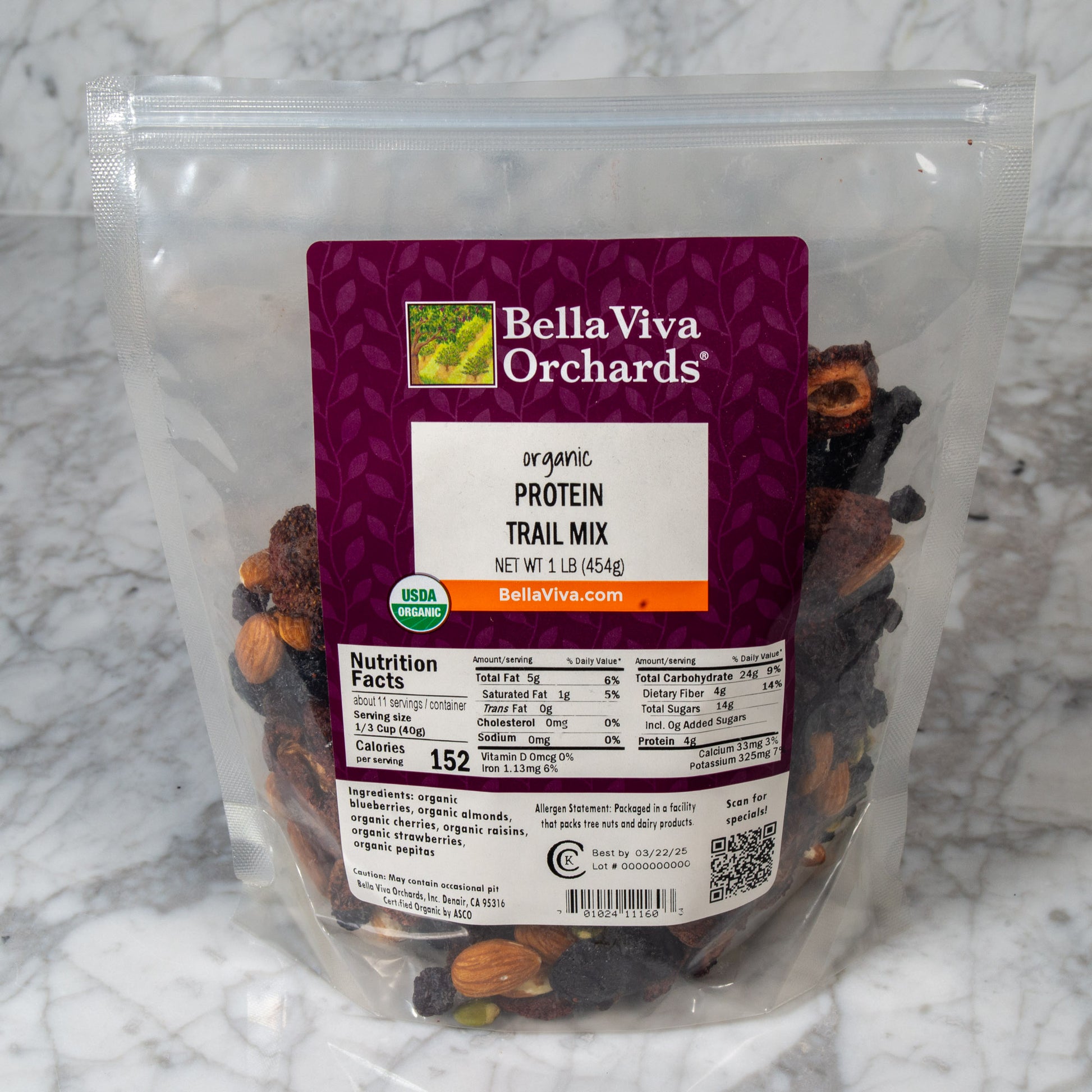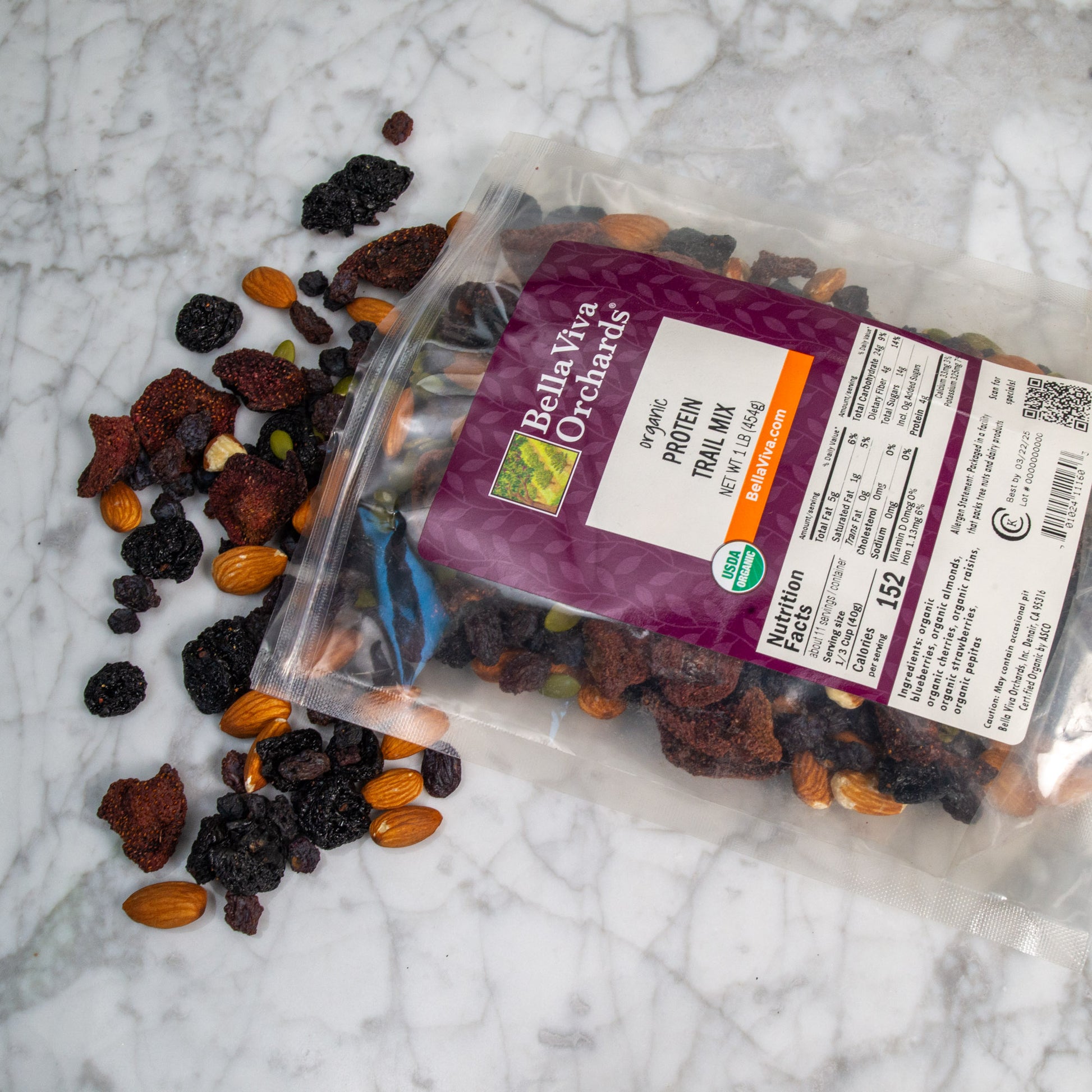I love Bella Viva Orchard nuts! They are gluten free, which is crucial for my safety, and the walnuts are the best I've tasted anywhere. I was looking forward to trying the Organic Protein Trail Mix. While the mix is tasty, with a variety of dried fruits, it disappointed me in being too low in protein. I would prefer it to have about 70-80% nuts and 20-30% fruit, but this mix is mostly fruit. A serving has about 4 grams of protein. I will add a bunch of nuts to this trail mix, and it will last me a long time.