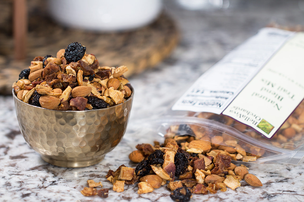 Kick your day into high gear with our Natural Blend Trail Mix. Our delicious California-grown fruit and nut trail mix contains a delectable mix of almonds and 6 different fruits: apricots, sweet apples, tart apples, pears, and peaches.