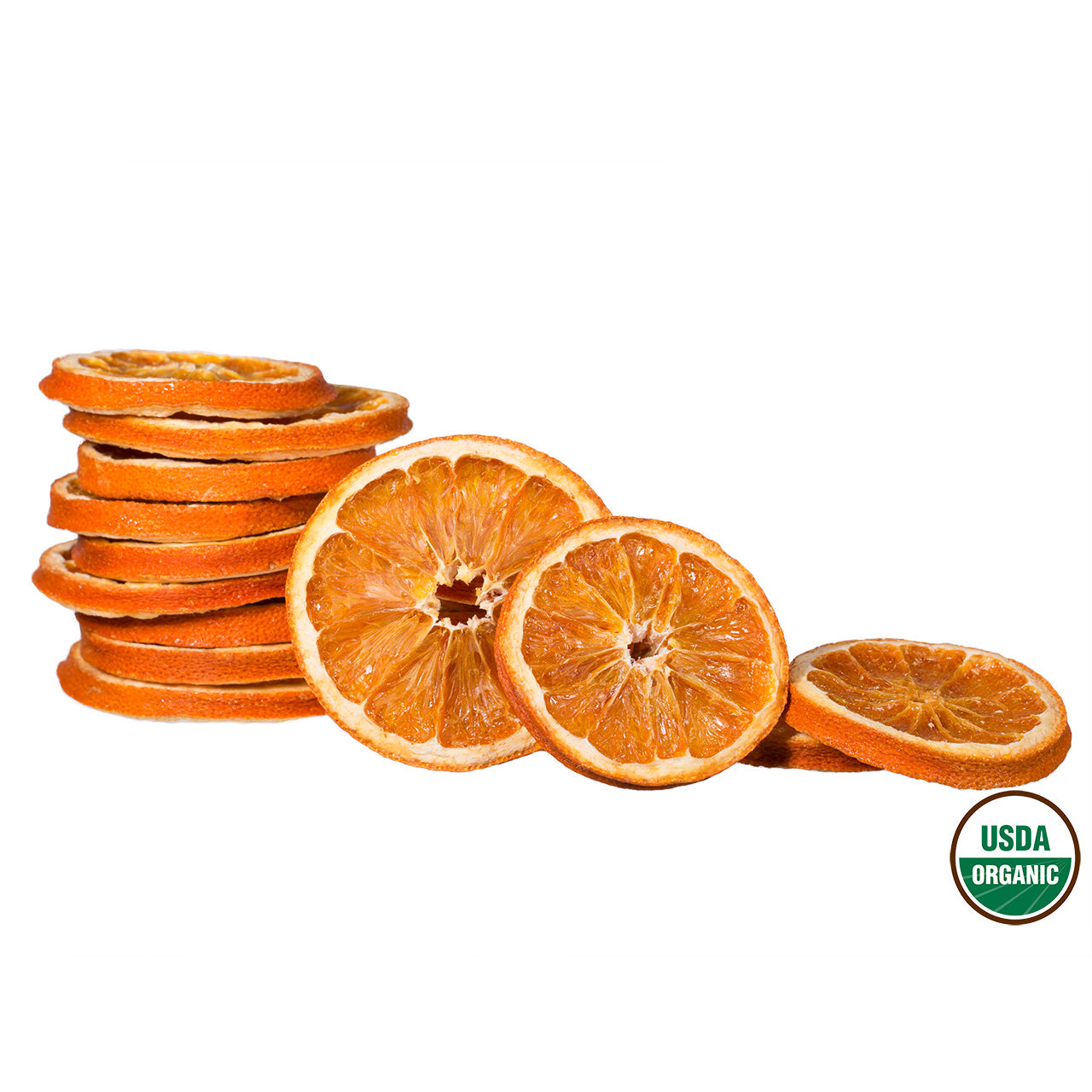 Our dried organic orange slices taste great and make a great snack with no added sugar or preservatives. Just one serving of these super fruits contains 110% USRDA Vitamin C. We like adding these dehydrated oranges to our tea for a fantastic citrus taste. They are also a great way to add excitement to muffins and pastries when diced up. Many people love to use these slices as decoration as they are so beautiful and delightful to smell. We have also found these organic orange slices to be an amazing ingredient in a sugary, stewed syrups to cover deserts like ice-cream.